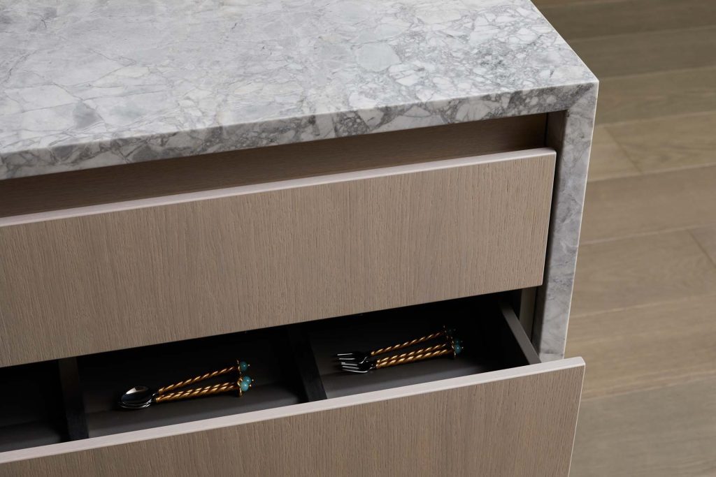 Both Bianco Macaubas and Bianco Eclipsia require precise fabrication due to their natural intricacy and long, linear veining. Each slab was carefully selected and positioned to achieve seamless visual flow across islands, splashbacks and extended surfaces. The thickness of 30mm provides a substantial architectural presence, complementing the elegance of the surrounding joinery and enhancing the overall weight and refinement of the kitchens.